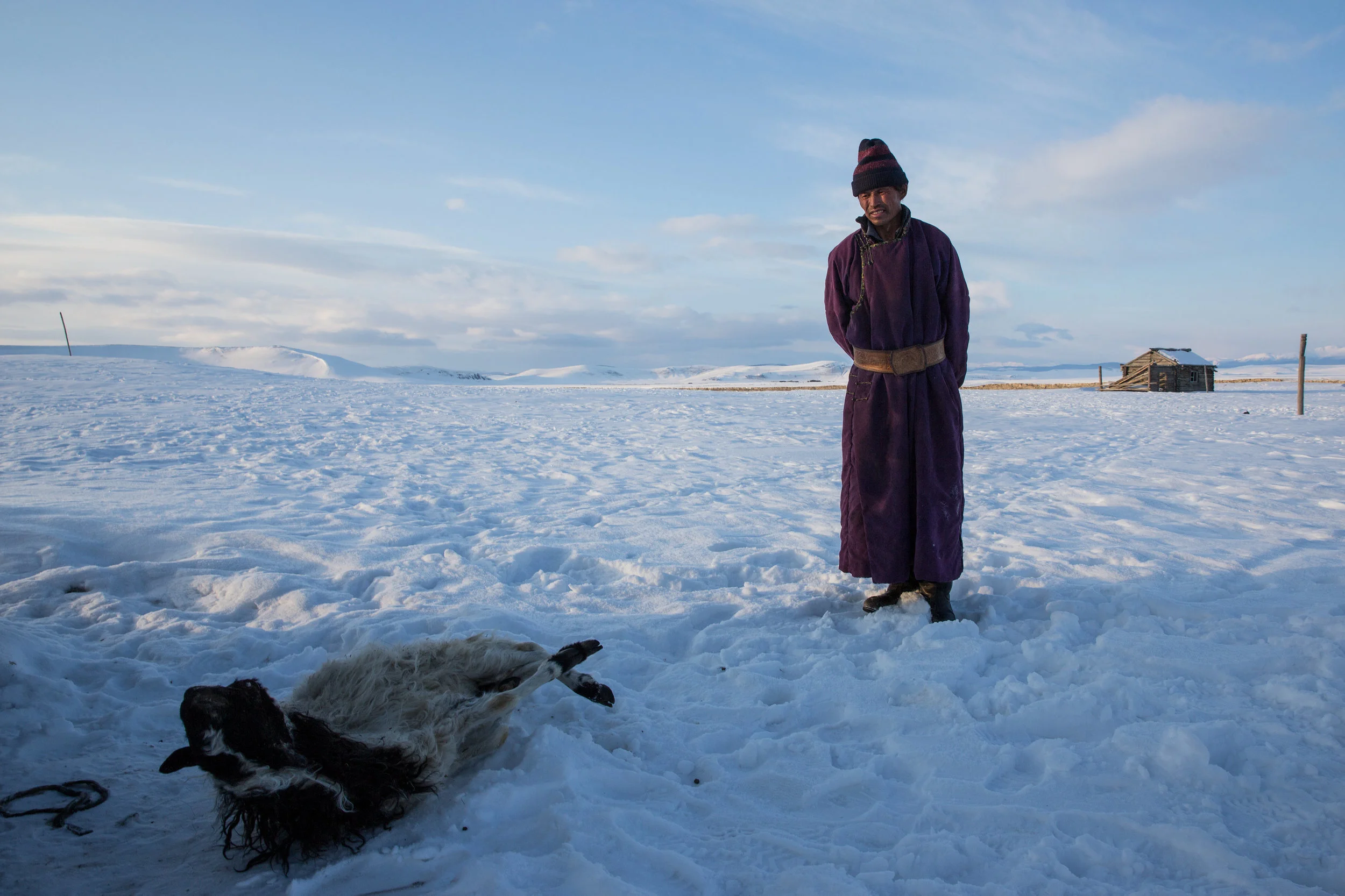 The 54-year-old herder is standing outside the wooden shed in which he is storing the carcasses of 20 of his animals. The sheep and goats, which Sharkhuu discovered dead one recent morning, represent just his latest loss – so far this winter, more than 100 of his 300 animals have perished, he says.