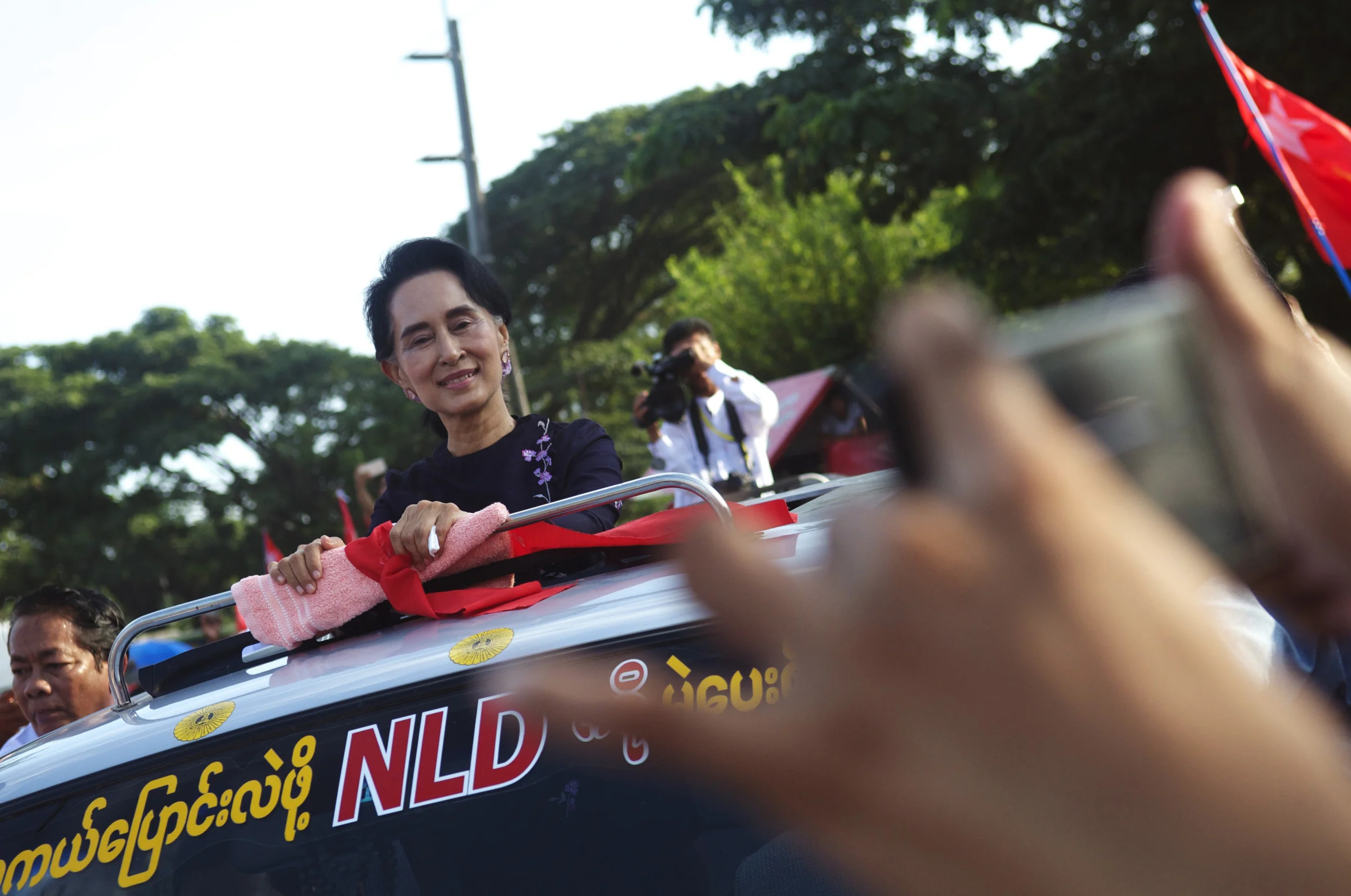 A week before Burma's historic election, NLD leader Aung San Suu Kyi arrived at a rally greeted by thousands of supporters. (Credit: Dene-Hern Chen)