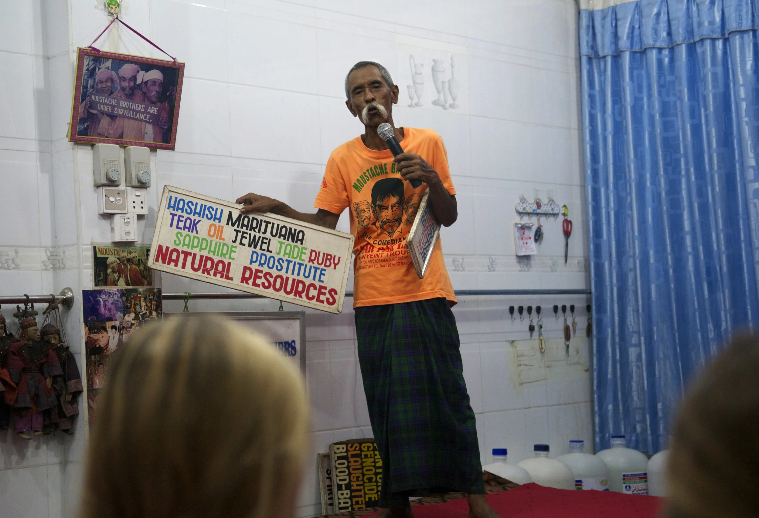 Lu Maw, one of the Moustache Brothers in Mandalay, entertains a crowd of foreigners during a show. (Credit: Dene-Hern Chen)