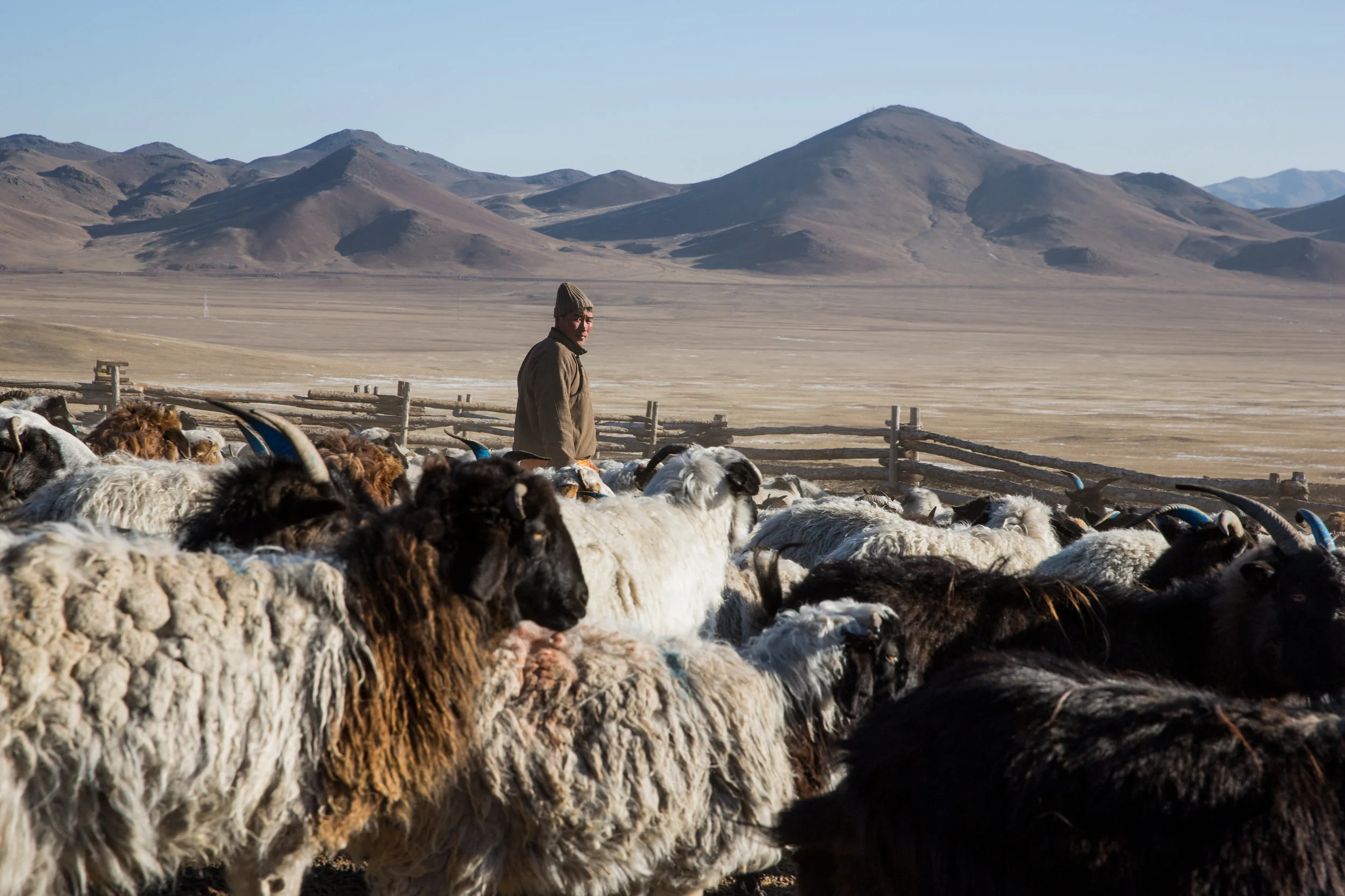 But the industry — as well as the nomadic herders who raise the goats — is at a crossroads. The rapid, exponential increase in livestock throughout the country has led to the decimation of pastures, which threatens desertification of the lands. Meanwhile, herders who are at a loss for how to gain a more viable income are hit hard by the growing frequency of harsh winter conditions, which is called a dzud — a Mongolian word referring to a weather phenomenon that can leave massive numbers of livestock dead due to heavy snowfall and ice.